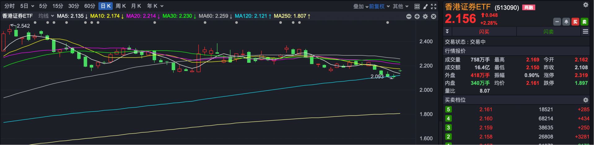 受上述消息刺激,今日券商股板块集体上涨。申万宏源香港(00218.HK)涨超9%,东方证券(03958.HK)、中信证券(06030.HK)、光大证券(06178.HK)、中国银河(03988.HK)涨超3%,中信建投证券、中州证券、国联民生、申万宏源、华泰证券、广发证券高开超2%。此外,香港证券ETF今日早盘涨超2%。