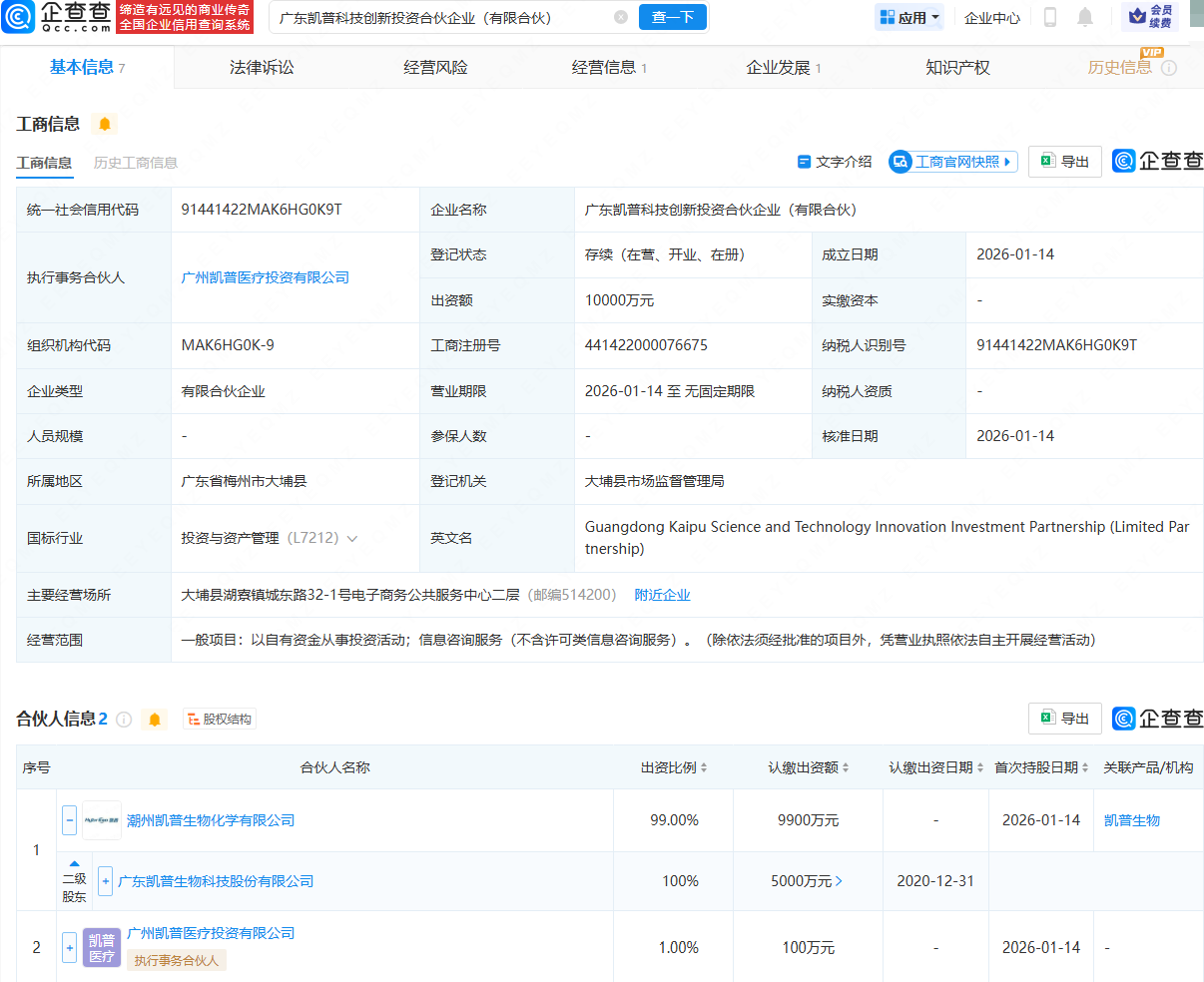近日,广东凯普科技创新投资合伙企业(有限合伙)成立,出资额1亿元,经营范围包含:以自有资金从事投资活动;信息咨询服务。企查查股权穿透显示,该合伙企业由凯普生物(300639)全资子公司潮州凯普生物化学有限公司、广州凯普医疗投资有限公司共同持股。